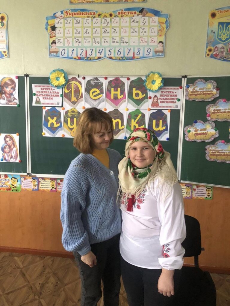 Діти познайомилися з особливостями жіночих головних уборів Черкащини та стали моделями для демонстрування найпоширеніших способів вив’язування хустки.
