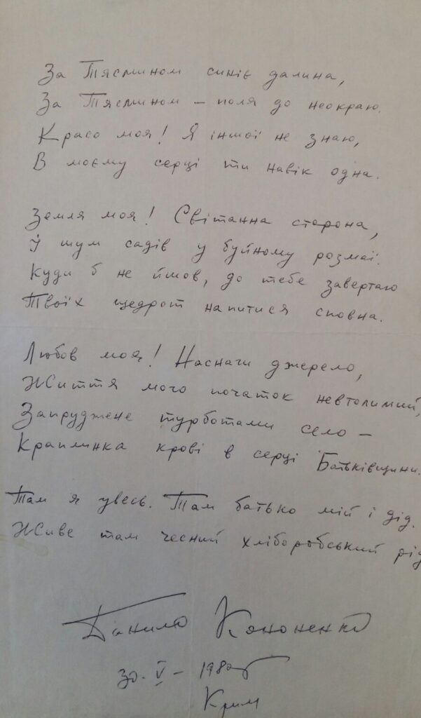 Переживання після анексії Криму призвели до тяжкої втрати – 15 січня 2015 року серце поета зупинилося. Але пам’ять про чудову людину, патріота жива. Про неї нагадують вірші юних поетів районної літстудії ім.Данила Кононенка, кращі поетичні твори відзначаються Всеукраїнською літературною премією його імені.