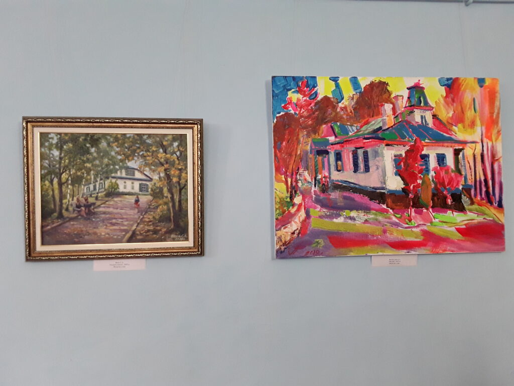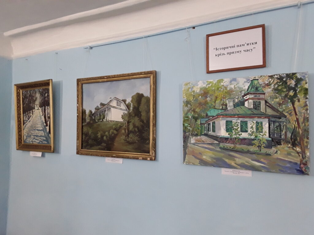 Більшу частину виставки складають картини, де зображений Зелений будиночок – пам’ятка історії та архітектури, що внесена до Державного реєстру Національного культурного надбання України, нині приміщення музею. За часів Давидових, на початку ХІХ століття, це був один із флігелів великої садиби, де розміщувалася частина бібліотеки, більярдна, столи для ігор. Під час своїх приїздів тут бував О.С. Пушкін, під дахом будинку проходили вільнодумні бесіди майбутніх декабристів, тишу та затишок будівлі полюбляв П.І. Чайковський.