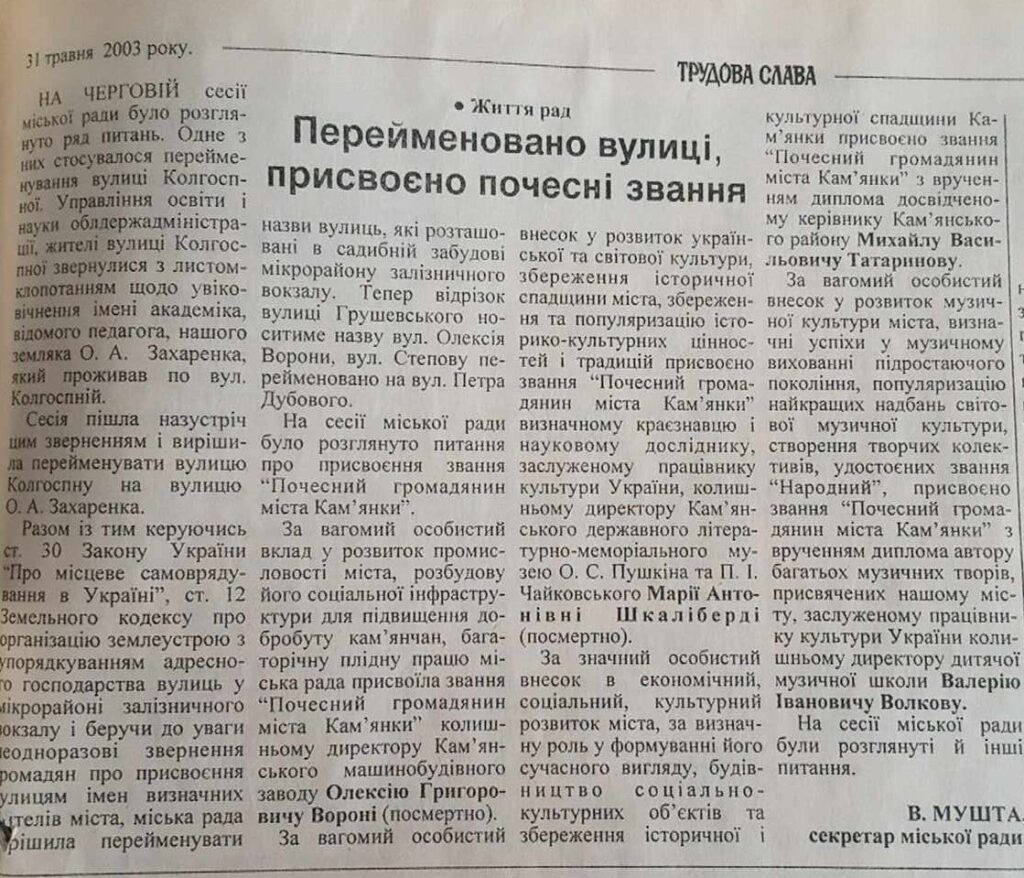 Паралельно, зазначимо, що така прискіплива увага до дотримання усіх процедурних механізмів стосувалась, як виявилось, саме щодо ініціативи рухівців. Адже у травні 2003 р. міська рада прийняла рішення про найменування 3 вулиць у місті: О.Ворони (колишнього директора машинобудівного заводу), П.Дубового (очільника партизанського загону в роки Другої Світової війни) та О.Захаренка (видатного педагога родом із Кам’янки). Це було зроблено до ювілеїв цих осіб та вшанування їхнього вкладу у розвиток тих чи інших галузей господарства та гуманітарної сфери.