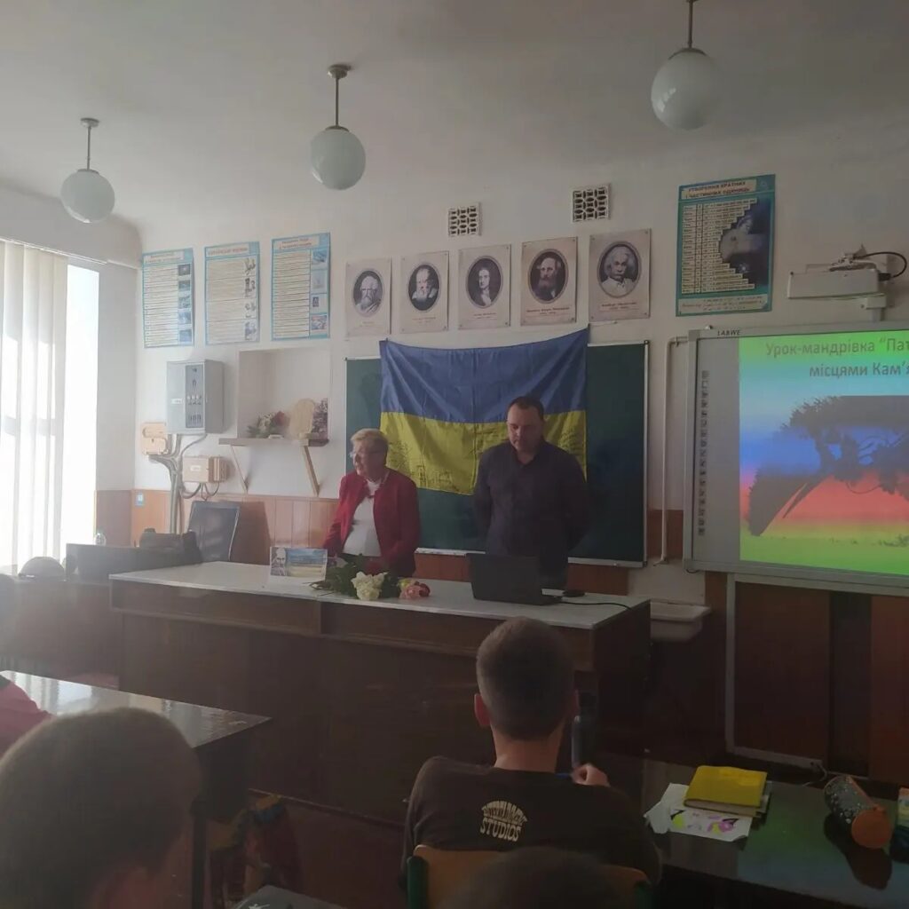 У межах відзначення Дня захисників України для учнів 8-го класу Кам’янської ЗОШ #2 було організовано тематичний захід. Завідувач меморіального музею Зелений будиночок Олександр Мушта розповів дітям про різні цікаві місця у нашому містечку, пов’язані з національно-паторітичним рухом 1990-х – поч. 2000-х рр. Це всім відомі локації, однак з своєю особливою історією. Зокрема: міський стадіон (тут вперше на велелюдній акції до 500-ліття козацтва замайорів синьо-жовтий прапор), парк (в цьому місці проводили перші акції національного спрямування – до Дня народження Т.Шевченка, до дня української мови, до дня пам’яті політичних репресій та ін.), будинок культури (в цьому місці було утворено Кам’янський осередок Руху у 1990 р.), приміщення поліції (тут таємно служили як розвідники представники Холодноярської повстанської організації), приміщення побуткомбінату (на даху цієї будівлі вперше таємно у ніч на 1 травня 1990 р. почепили синьо-жовтий прапор) та ін. Всі ці місця відомі кожному кам’янчанину, але після цієї зустрічі школярі будуть дивитись на ці місця уже під іншим кутом зору. Національна ідеологія – це складова частина держави для унеможливлення різного роду сепаратизму, зневіри, морального занепаду, що використовував завжди москальський ворог для захоплення українських земель. Це яскраво було помітно і з початку війни у 2014 р. Для формування стійкого покоління українців, морально готових до різних випробувань потрібно їх готувати шляхом розкриття сторінок минулого та наповнення національним змістом. Все це й виконають працівники заповідника у своїй навчально-освітній роботі. Освічене та свідоме молоде покоління українців – запорука успішного майбутнього.