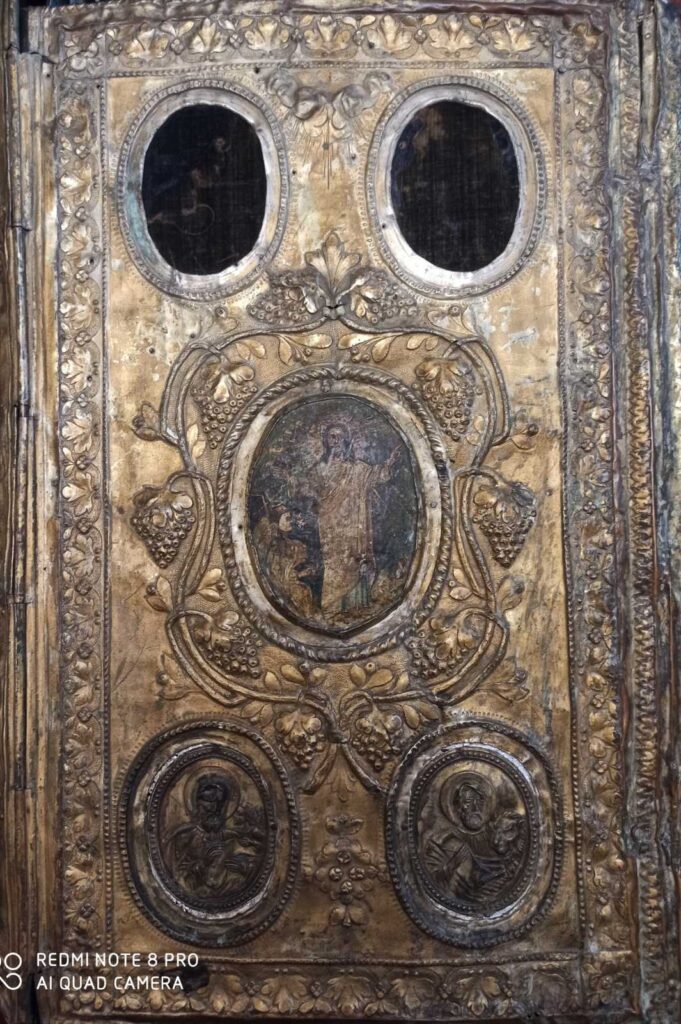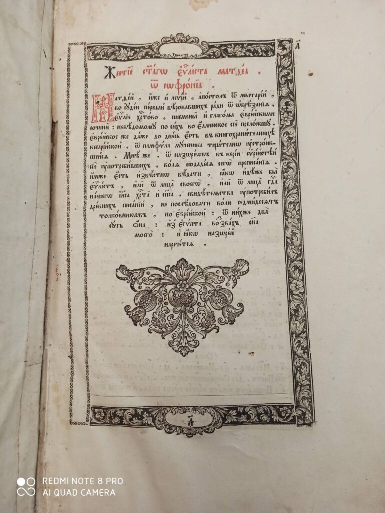 Одним із цінних експонатів, що знаходиться у фондах Кам’янського державного історико-культурного заповідника є книга Євангеліє ( Богослужебна, напрестольна) 1735 р. Книга надійшла до фондів заповідника в листопаді 1983 року. Книга в металевій палітурці з декоративною чеканкою та п’ятьма медальйонами на лицевій стороні, пофарбована під позолоту. Центральний медальйон – зображення Ісуса Христа з ангелом на дереві. У нижніх медальйонах у техніці чеканки зображення Євангелістів св. Луки та св. Іоана – на звороті сцена розп’яття Ісуса Христа з трьома святими. Книга має чотири круглі ніжки у металевому обрамленні, та дві металеві застібки. З обох сторін по периметру на палітурці зображений рослинний орнамент. Центральний медальйон на лицевій стороні обрамлений зображенням лози з гронами винограду( в металі ). Корінець книги декорований окремими зображеннями із Святого письма. Нажаль нижня частина корінця має пошкодження – втрачена частина металу. Книга написана старослов’янською мовою.