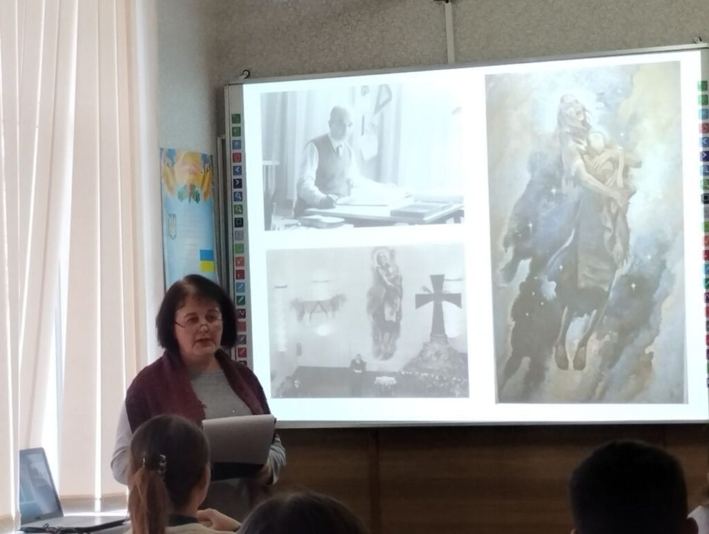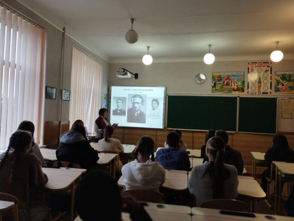 Під час розповіді старшокласники дізналися про життєвий та творчий шлях Віктора Івановича Цимбала – художника, графіка, уродженця Черкащини, ветерана армії УНР, театрального декоратора, мецената, громадського діяча. А ще популярного художника реклами, якому робили замовлення відомі на весь світ торгові марки(General Motors, Ford, Shell, Kodak, Coca – Cola, Martini, Opel, Nestle та ін. )