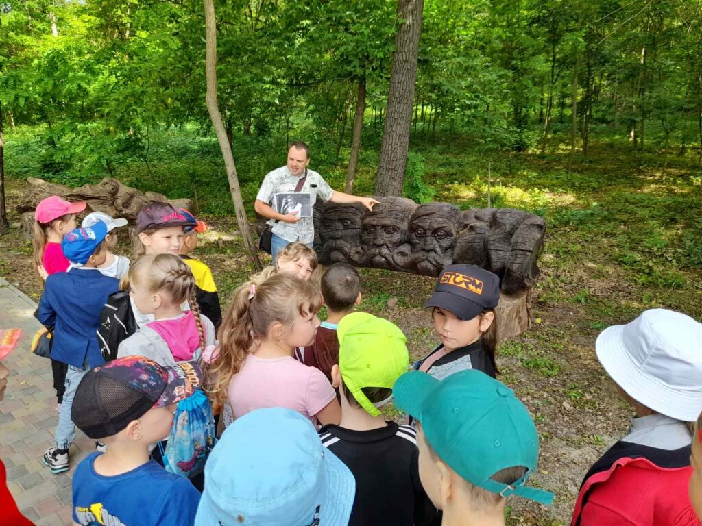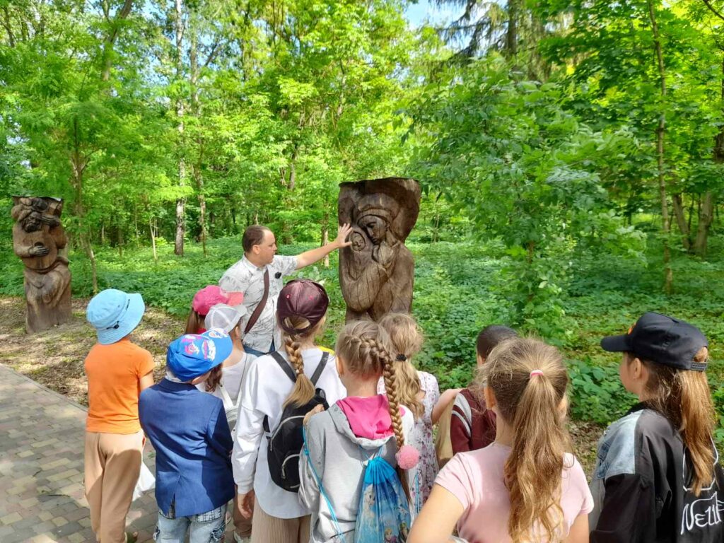 Далі учні спустились до алеї дерев’яних скульптур Бориса Плаксія, де їм було розказано про історію життя легендарного художника, скульптора та дисидента, який, не зважаючи на тиск радянської влади, зумів реалізувати свій талант, пронизивши свою творчість яскравими пам’ятками з чітким українським змістом. Діти з цікавістю розглядали фігури та ознайомились з їхніми мистецькими особливостями.