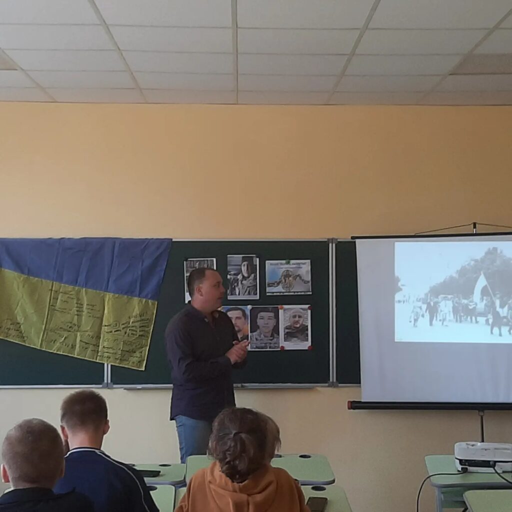 Звісно, основний акцент під час заняття було спрямовано на розповідь життя і подвигу сучасних героїв війни, які віддали своє життя за волю і незалежність України. Зважаючи на місце проведення заходу, учням було розказано про 2 випускників ЗОШ #2: Юлію Пастернак та Євгена Погорілого. Обоє загинули у 2022 р. Пам’ять про їхнє життя, чин, військову доблесть завжди житиме у наших серцях.